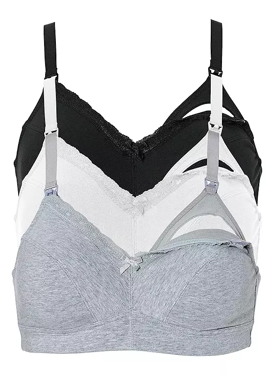 Non-wired. Three stretch cotton nursing bras with cotton lined drop-down cups.