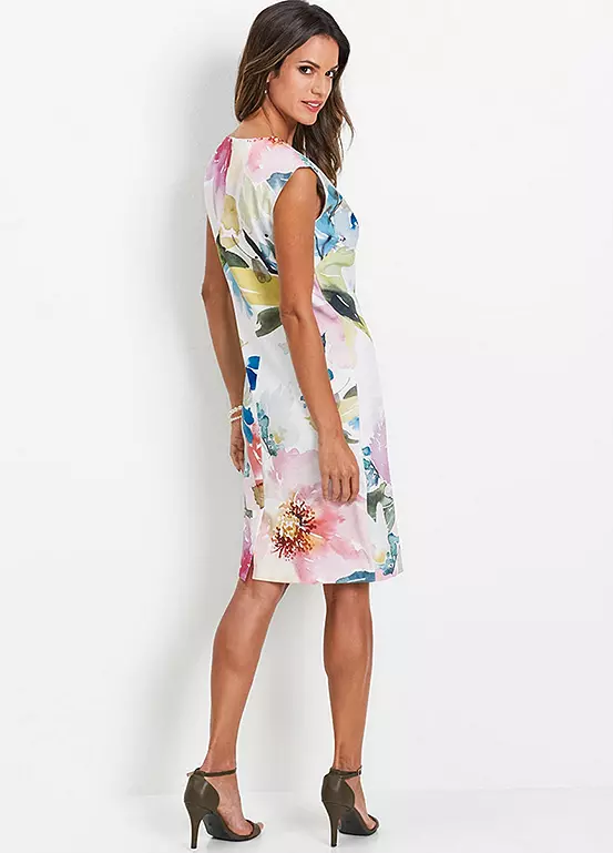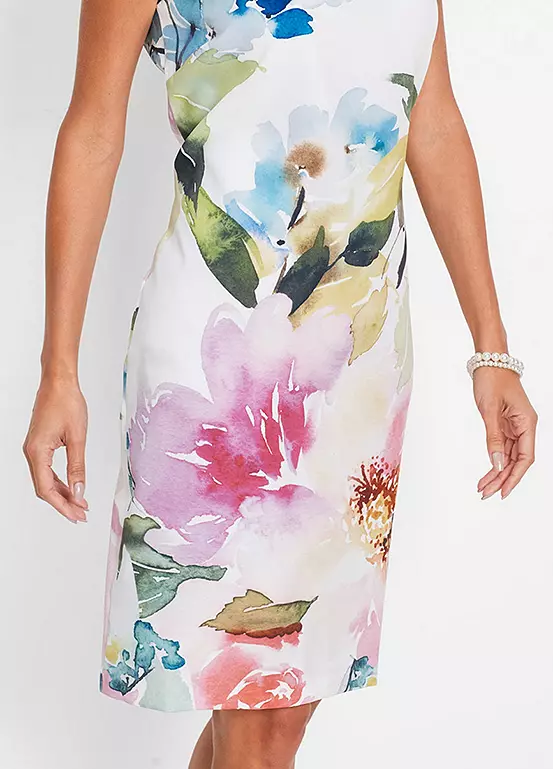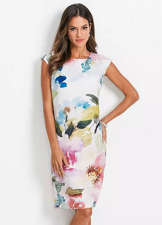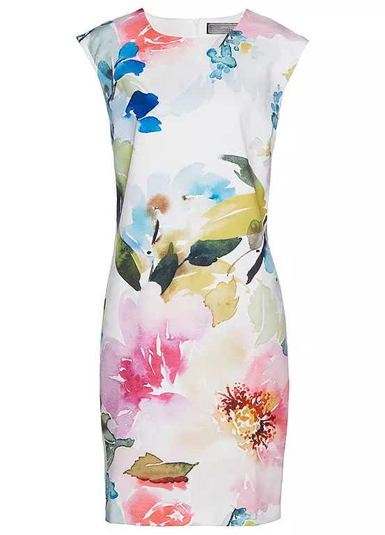 A fitted shift dress with a painterly floral print. Machine washable. 95% Polyester, 5% Elastane. Length approx. 100 cm.