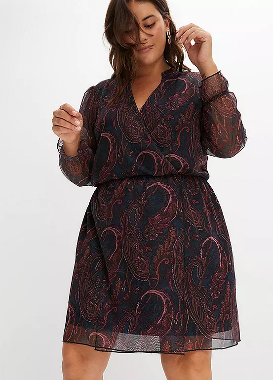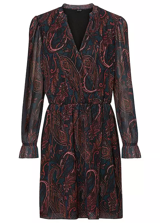Paisley print skater dress with sheer net sleeves. Length approx. 94 cm.