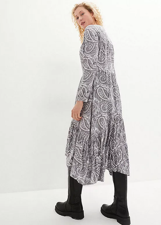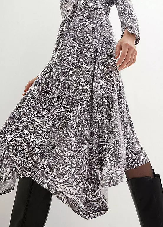 Long sleeve jersey dress with a hanky hem and paisley print. Machine wash. Length approx. 120 cm.