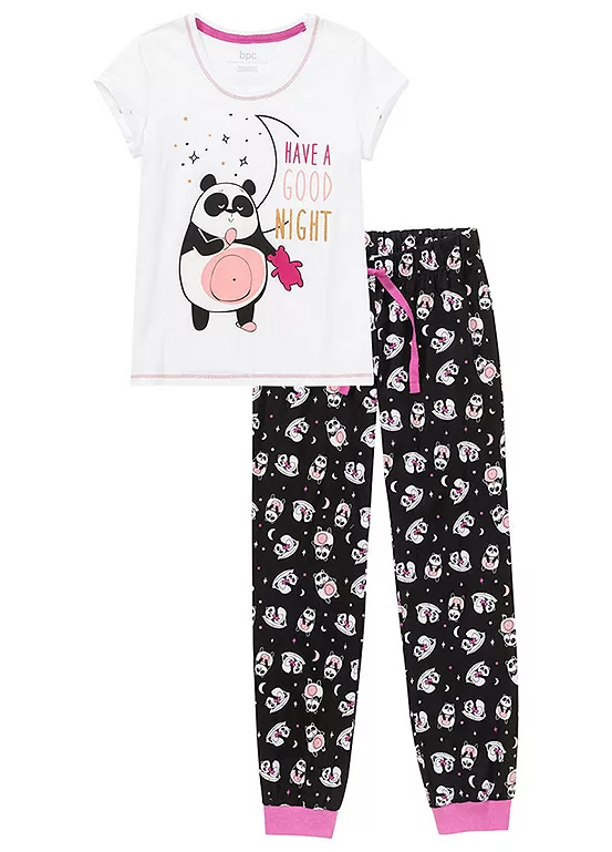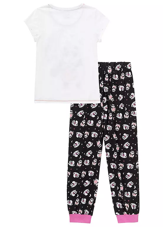 A short sleeve PJ top with a panda print and matching bottoms. Machine washable. 100% Cotton.
