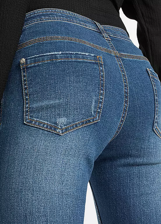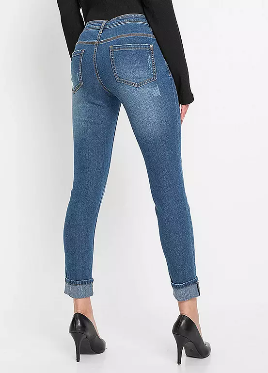 A pair of skinny fit jeans with a regular rise and turn-up hems. Machine washable.