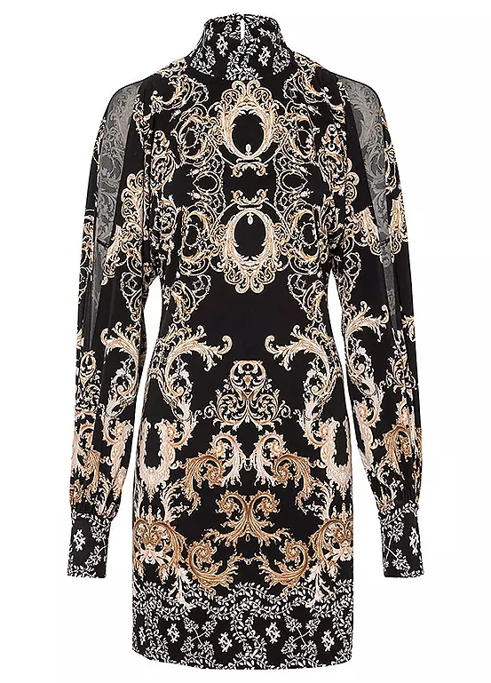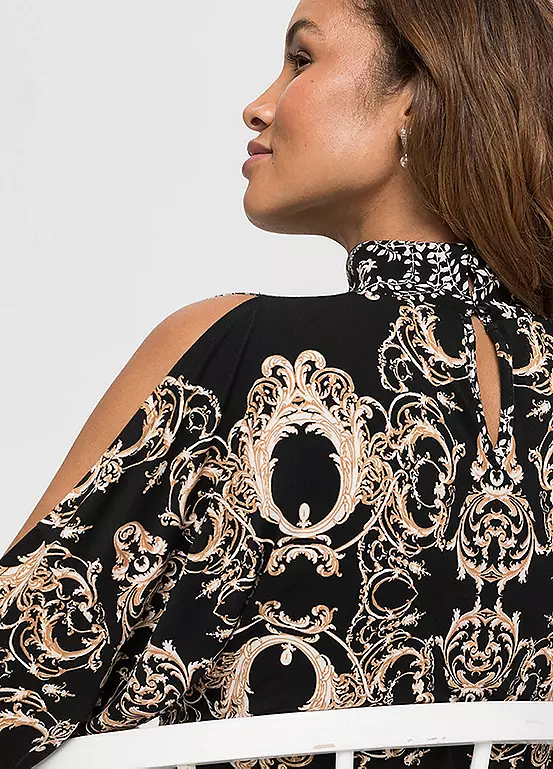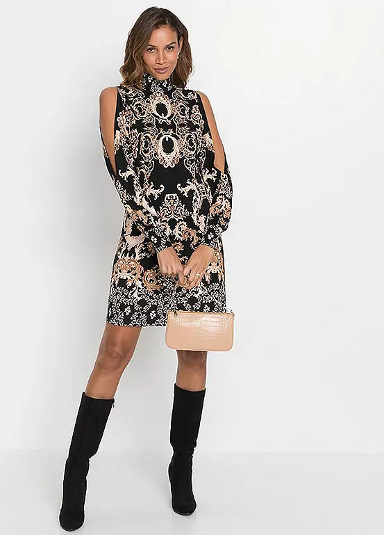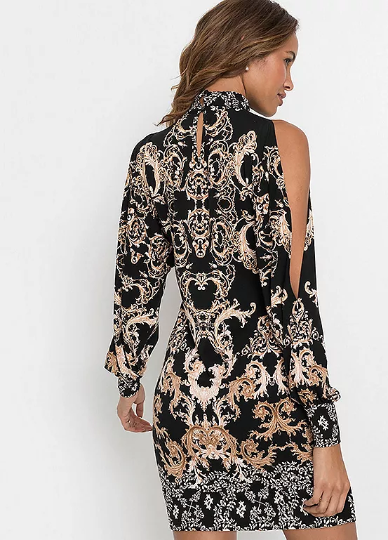 Printed dress with cut-out shoulders. Machine wash. Length approx. 90 cm.