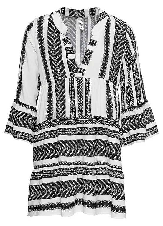 A printed summer dress with three-quarter length sleeves. Machine washable. 100% Viscose. Length approx. 90 cm.
