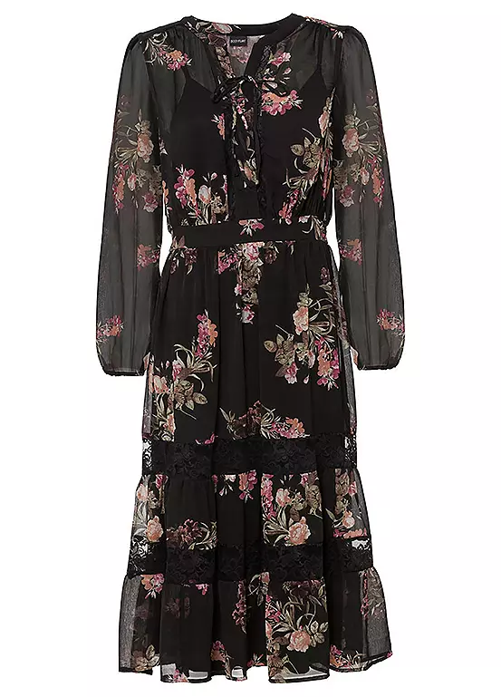 A printed dress with ties at the collar. Length approx. 120 cm.