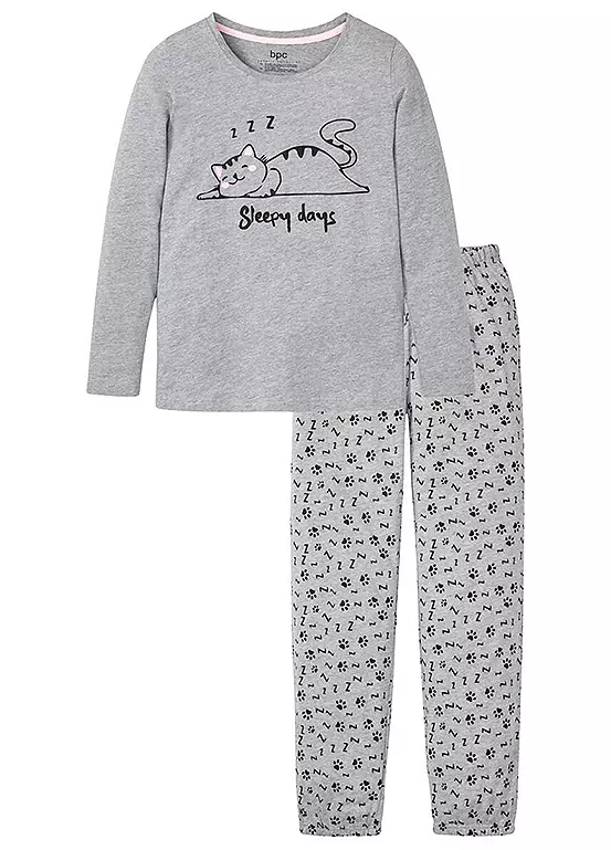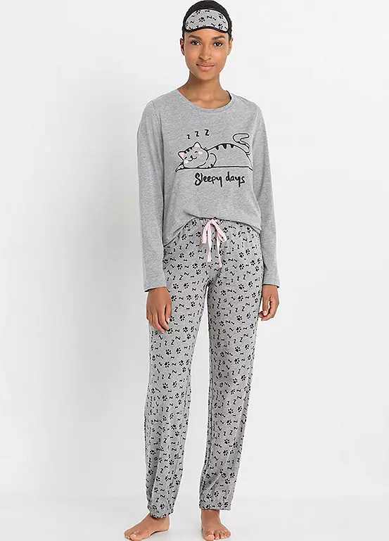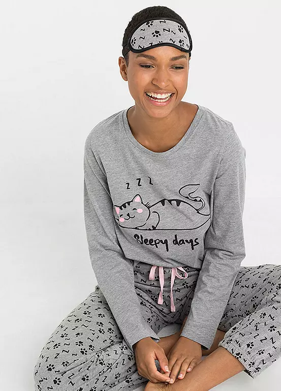 Cotton pyjamas with a matching sleep mask. Machine washable.