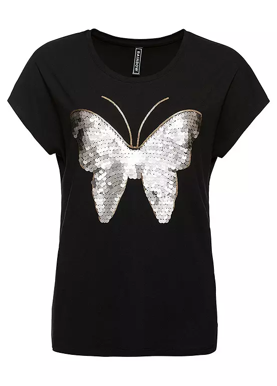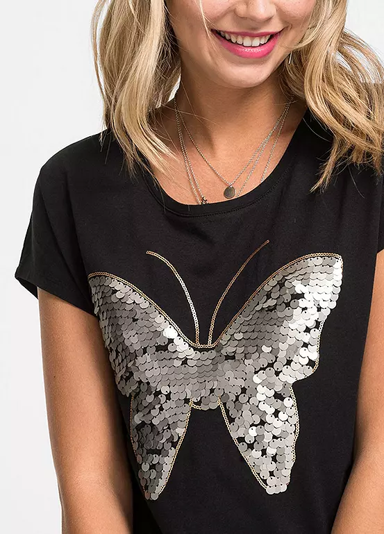 A fitted jersey top with a glittery sequin butterfly motif at the front. Machine washable. 50% Viscose, 50% Cotton. Length approx. 66 cm.