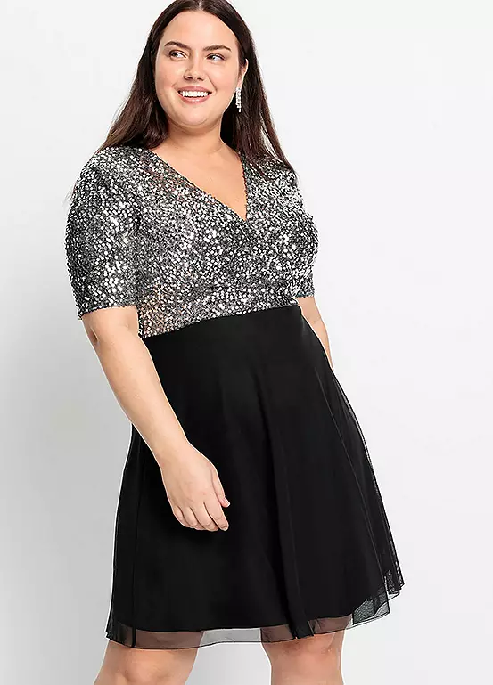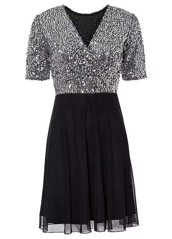 Stylish dress with a sparkling sequin bodice and a chiffon shell skirt. Machine wash. Length approx. 94 cm.
