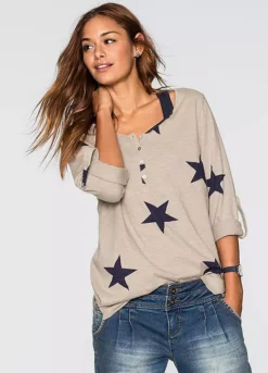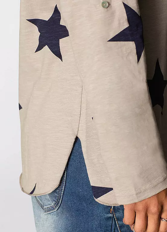 A long sleeve cotton top with a button panel collar, side vents and a star print design. Machine washable. 100% Cotton. Length approx. 74 cm.
