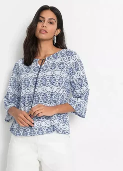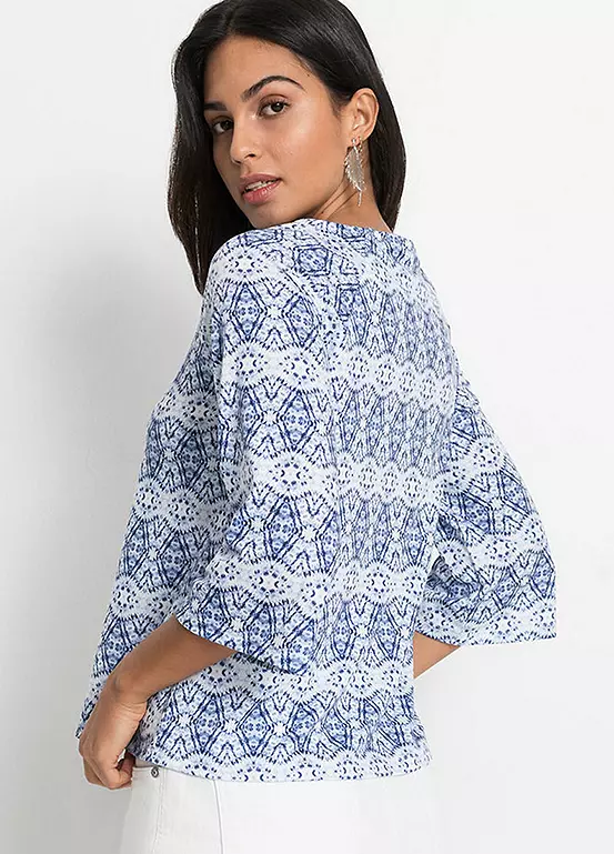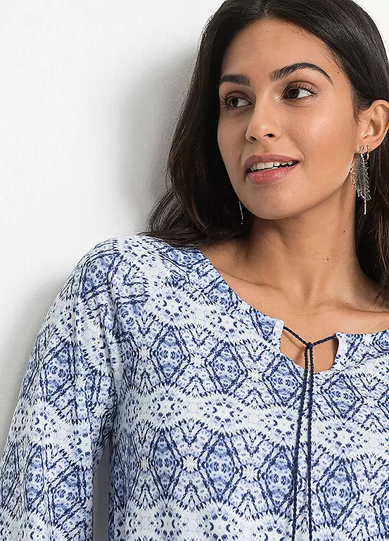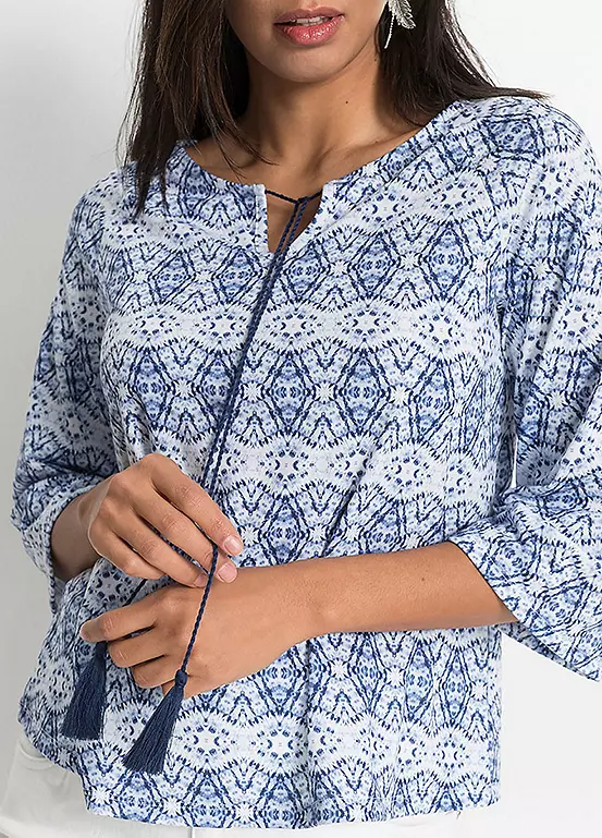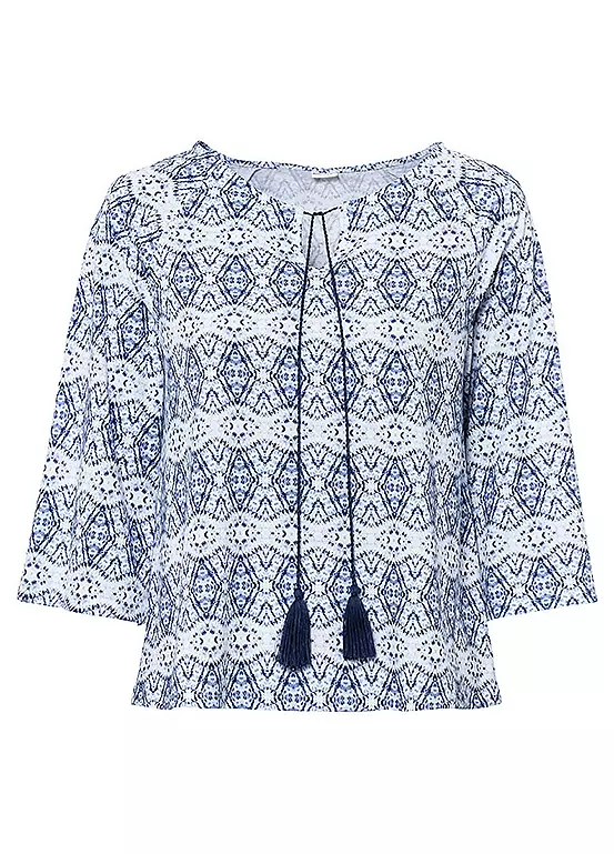 Printed tunic with tassel ties at the collar and three-quarter sleeves. Length approx. 60 cm.