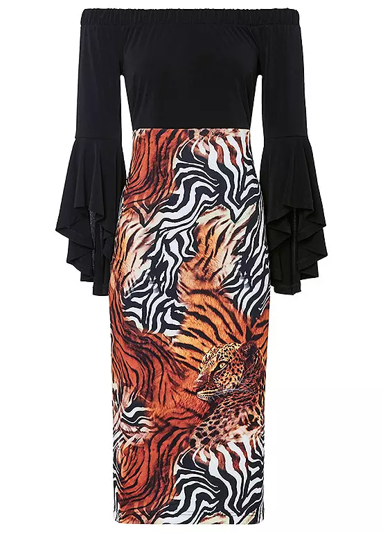 Off-the-shoulder dress with a tiger print skirt. Length approx. 114 cm.