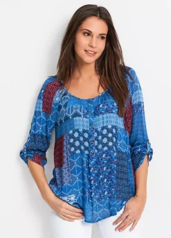 This crushed viscose tunic has a feminine gathered neckline with a button panel. The swinging tunic shape falls loosely around your upper half, and the tab sleeves can be rolled up. Machine washable. 100% Viscose. Length from approx. 66 – 80 cm.