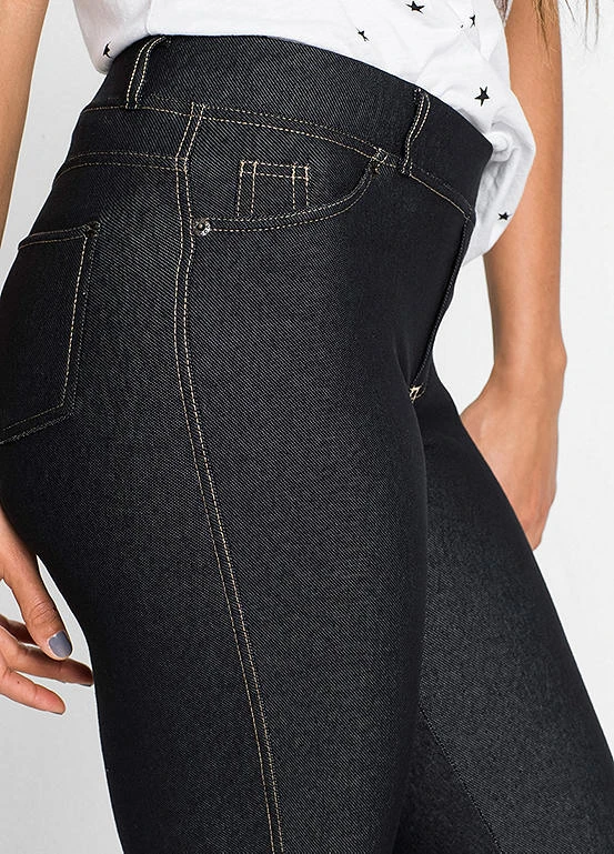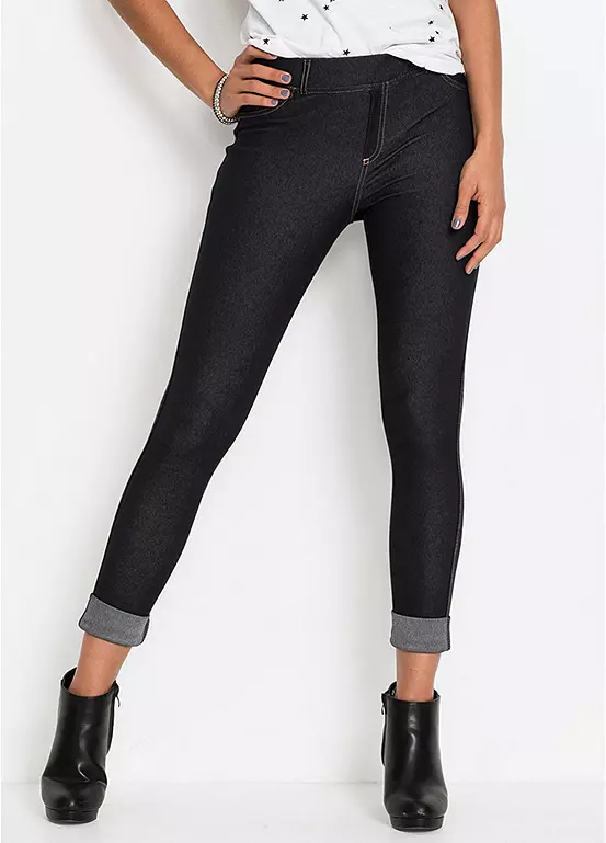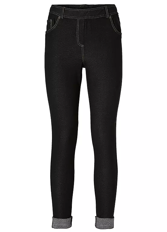 A figure hugging pair of stretch jeggings with turn-up hems. Machine washable. Length approx. 65.5 cm.