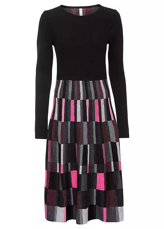 A two tone knitted dress with a single colour bodice and a checked skirt. Machine washable. 100% Acrylic. Length approx. 104 cm.