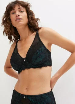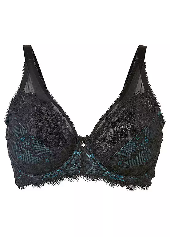 An underwired minimiser bra with a lace shell. Hand wash. 80% Recycled Polyamide, 20% Elastane. Lining: 80% Polyamide, 20% Elastane. Net Lining: 92% Polyamide, 8% Elastane. Lace: 88% Polyamide, 12% Elastane